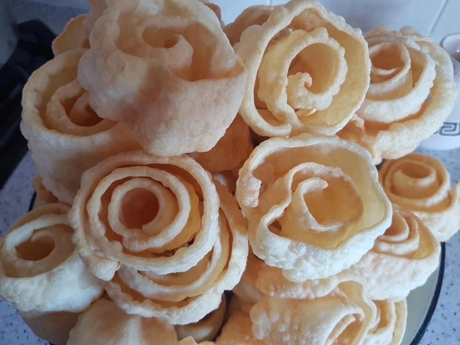 Ҡамыр ял иткәс, йоҡа ғына итеп йәйеп, 3 см киңлектә, 30 см тирәһе оҙонлоҡтағы таҫмаларға фигуралы киҫкес менән киҫәбеҙ. Таҫмаларҙы ағас ҡалаҡтың тотҡаһына урап, икенсе ҡулға оҙон ағас ҡалаҡ менән йәйелеп китмәһен өсөн тотоп, ҡыҙған майҙа ике яҡлап ҡыҙҙырабыҙ. Унан шәкәр пудраһы һибеп, табынға сығарабыҙ.